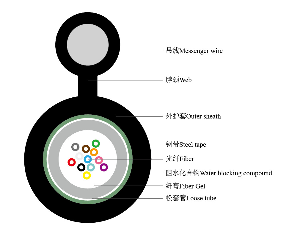 Its structure combines a central loose tube filled with gel, corrugated steel tape armor, and a separate messenger wire—either a galvanized steel strand or a single steel wire—forming a strong and reliable 8-shape profile ideal for pole-to-pole spans.